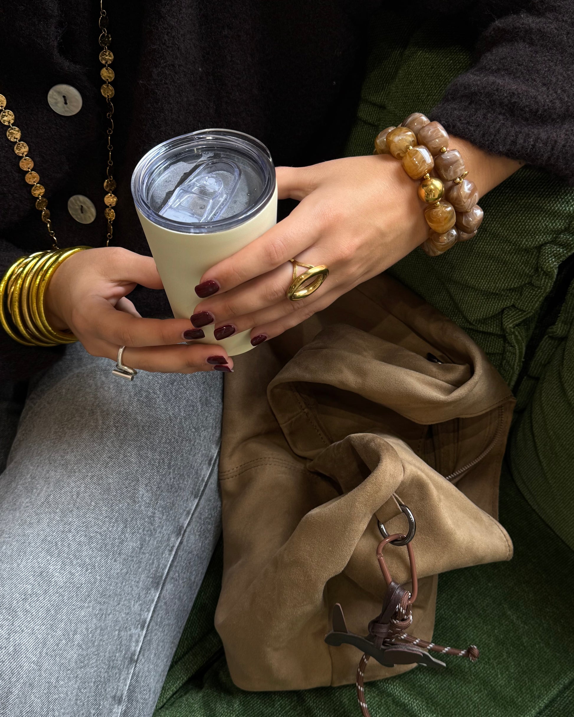 Un bracelet élastiqué en perles effet marbré avec une touche dorée centrale. Idéal porté seul ou en accumulation pour un look tendance.