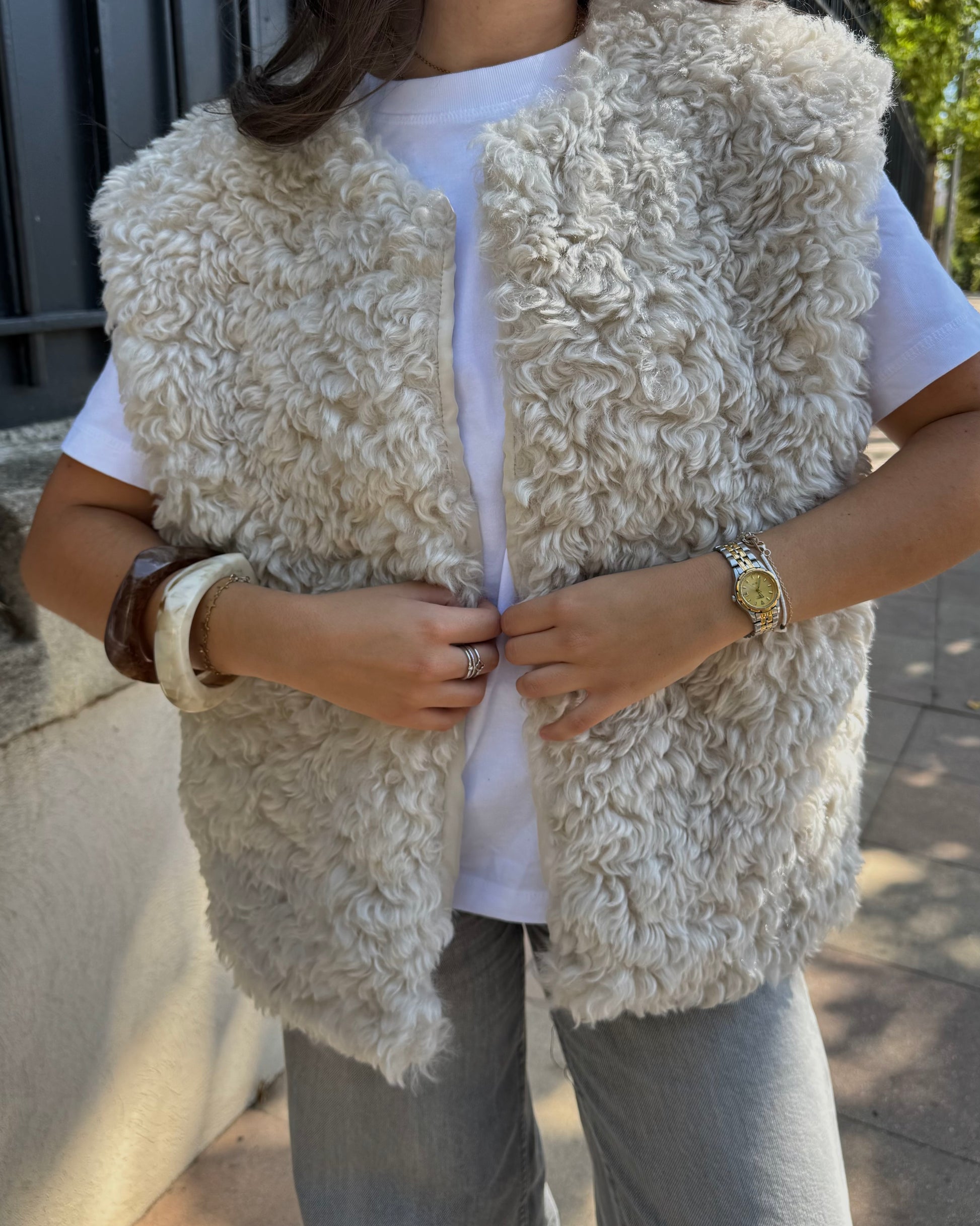 Tendance et pratique, la veste sans manches en fausse fourrure boucle s’associe avec tout.