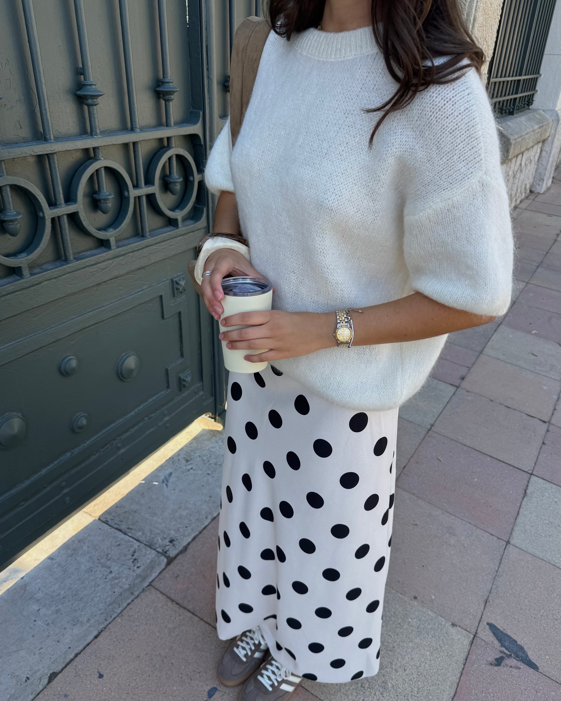 La jupe fluide à pois qu’on adore ! Chic et légère, elle se porte aussi bien avec un pull douillet qu’un top ajusté.