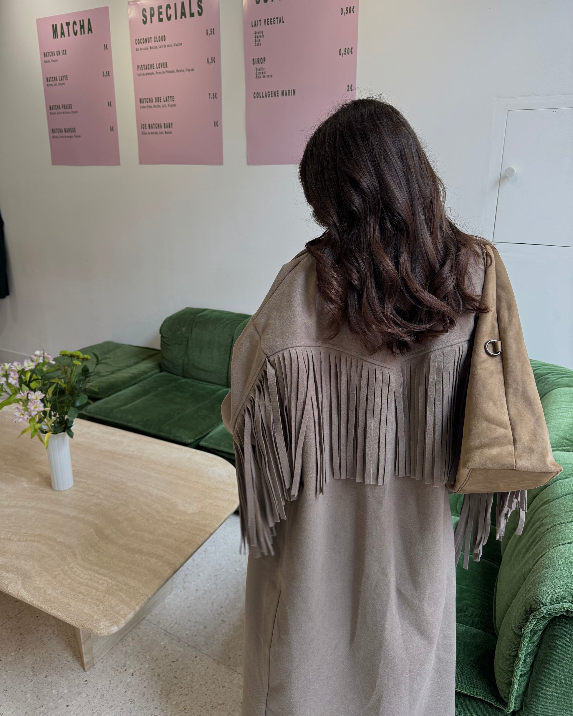 L’incontournable de la saison ! Long manteau fluide orné de franges pour un look bohème-chic qui ne passe pas inaperçu.